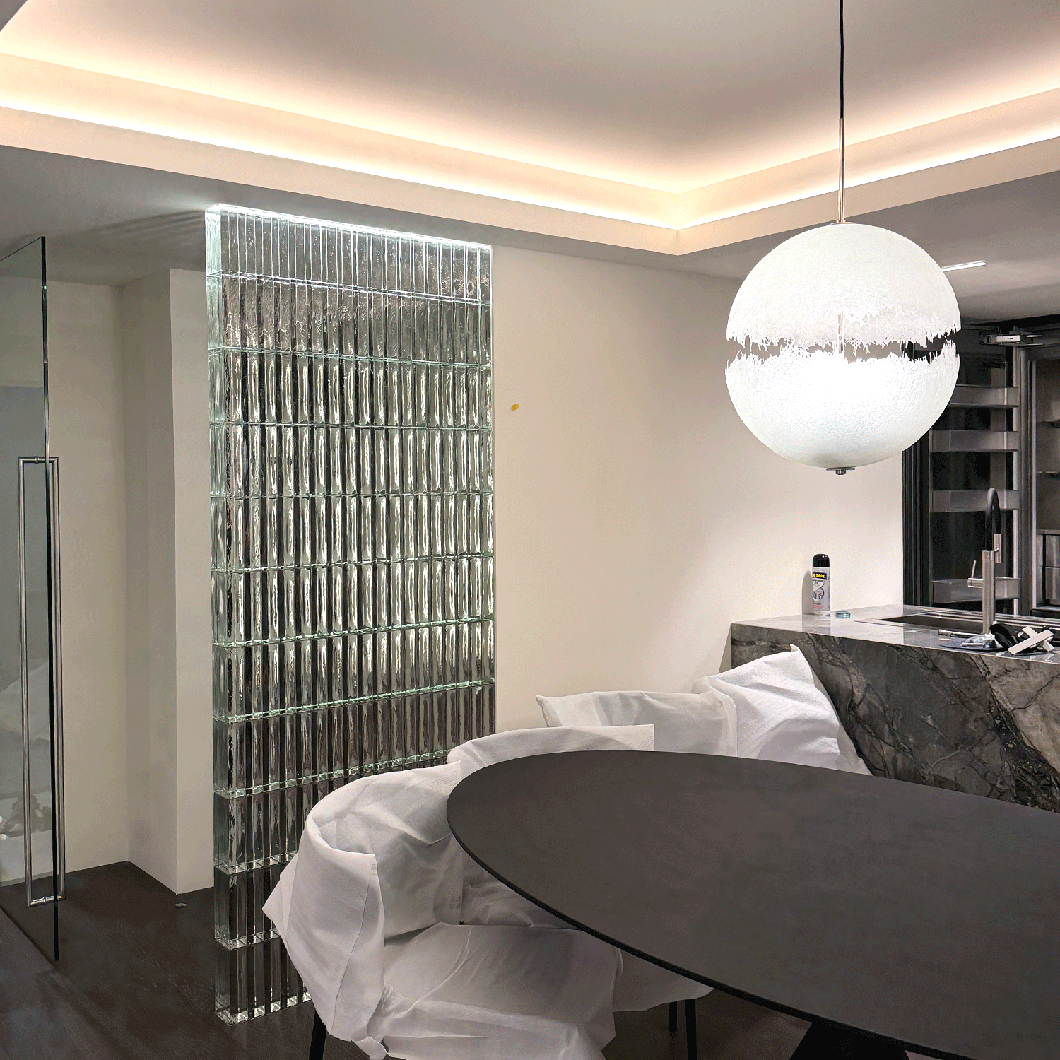 현대아파트 인테리어 시공 이번 시공 현장은 절제된 모던함을 추구하는 인테리어 컨셉에 맞춰 진행되었습니다. 특히 유리벽돌을 활용한 수직 파티션이 공간의 중심을 잡아주는 핵심 디자인 포인트로 활용되었습니다. 주방과 다이닝 공간을 나누는 대형 유리벽돌 벽체는 이번 현장의 하이라이트입니다. 통유리가 주는 차가운 느낌 대신, 벽돌 한 장 한 장이 쌓여 만들어내는 입체적인 텍스처와 줄눈의 리듬감이 공간에 깊이감을 더해줍니다. https://blog.naver.com/seochangbrick/224202823497