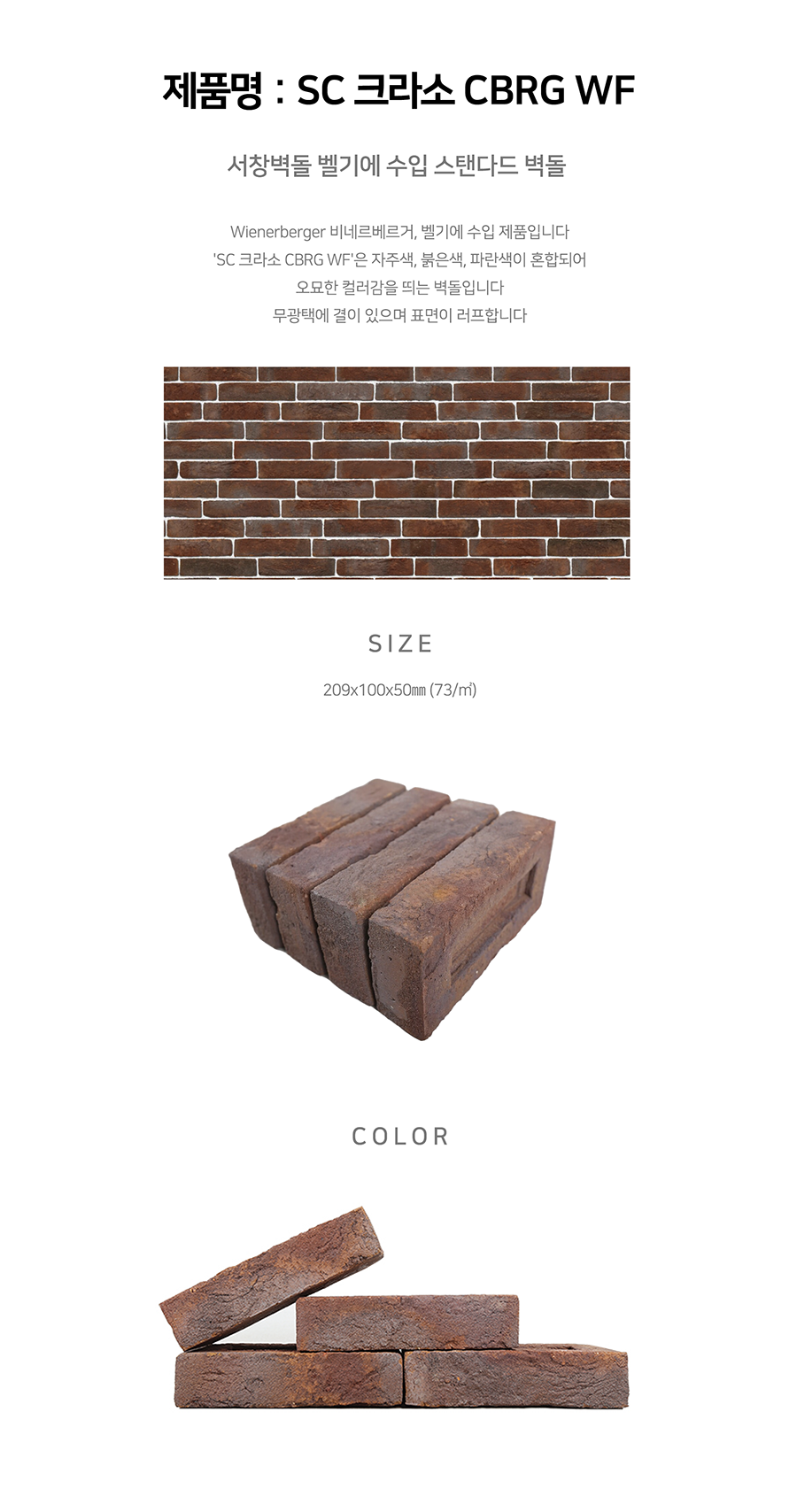'SC 크라소 CBRG WF'은 자주색, 붉은색, 파란색이 혼합되어 오묘한 컬러감을 띄는 벽돌입니다. 무광택에 결이 있으며 표면이 러프합니다.