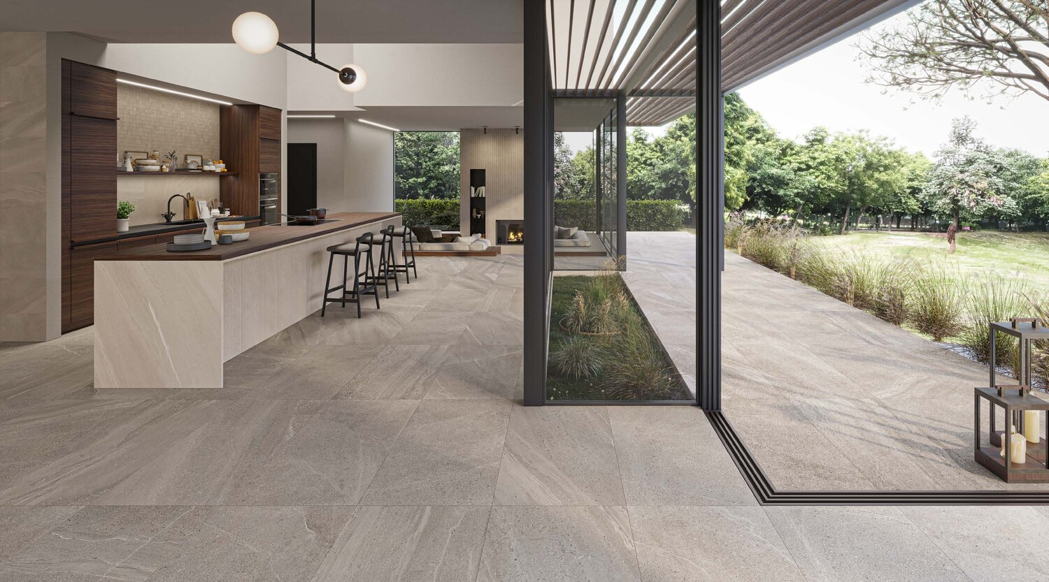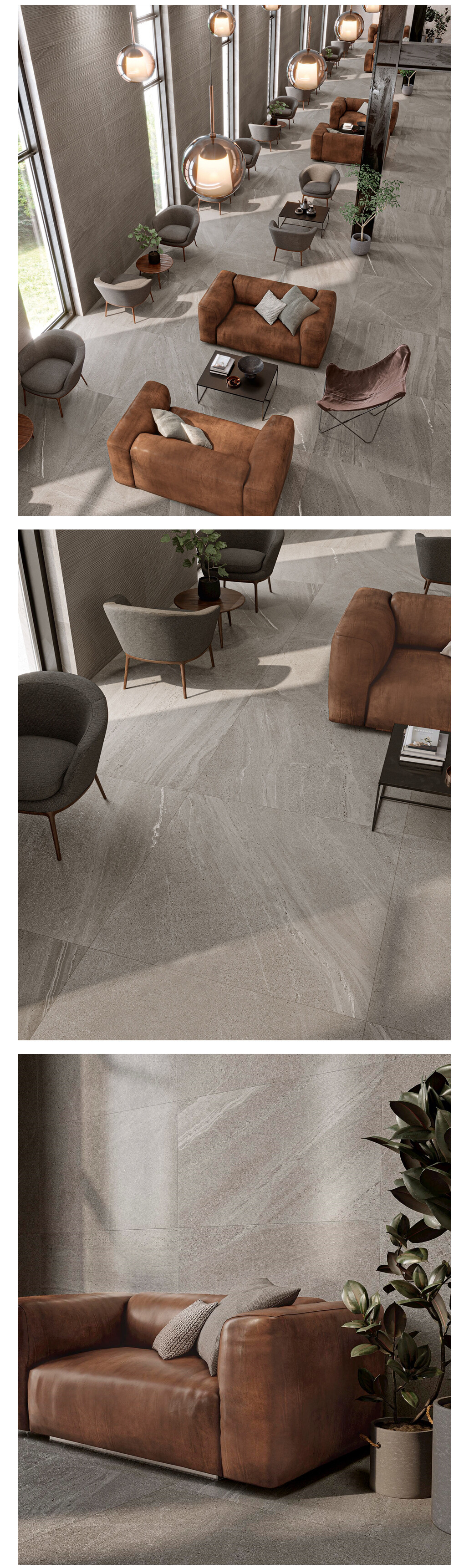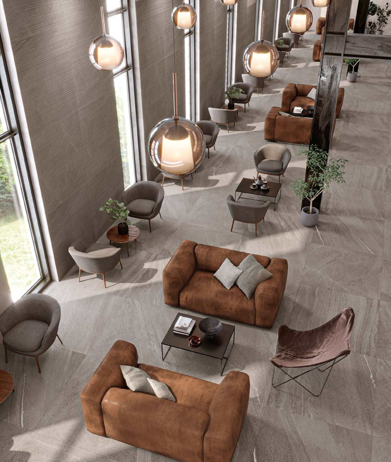 넓은 포맷 타일이 연출하는 시원한 스케일감은 로비, 라운지, 고급 상업공간에 이상적입니다.