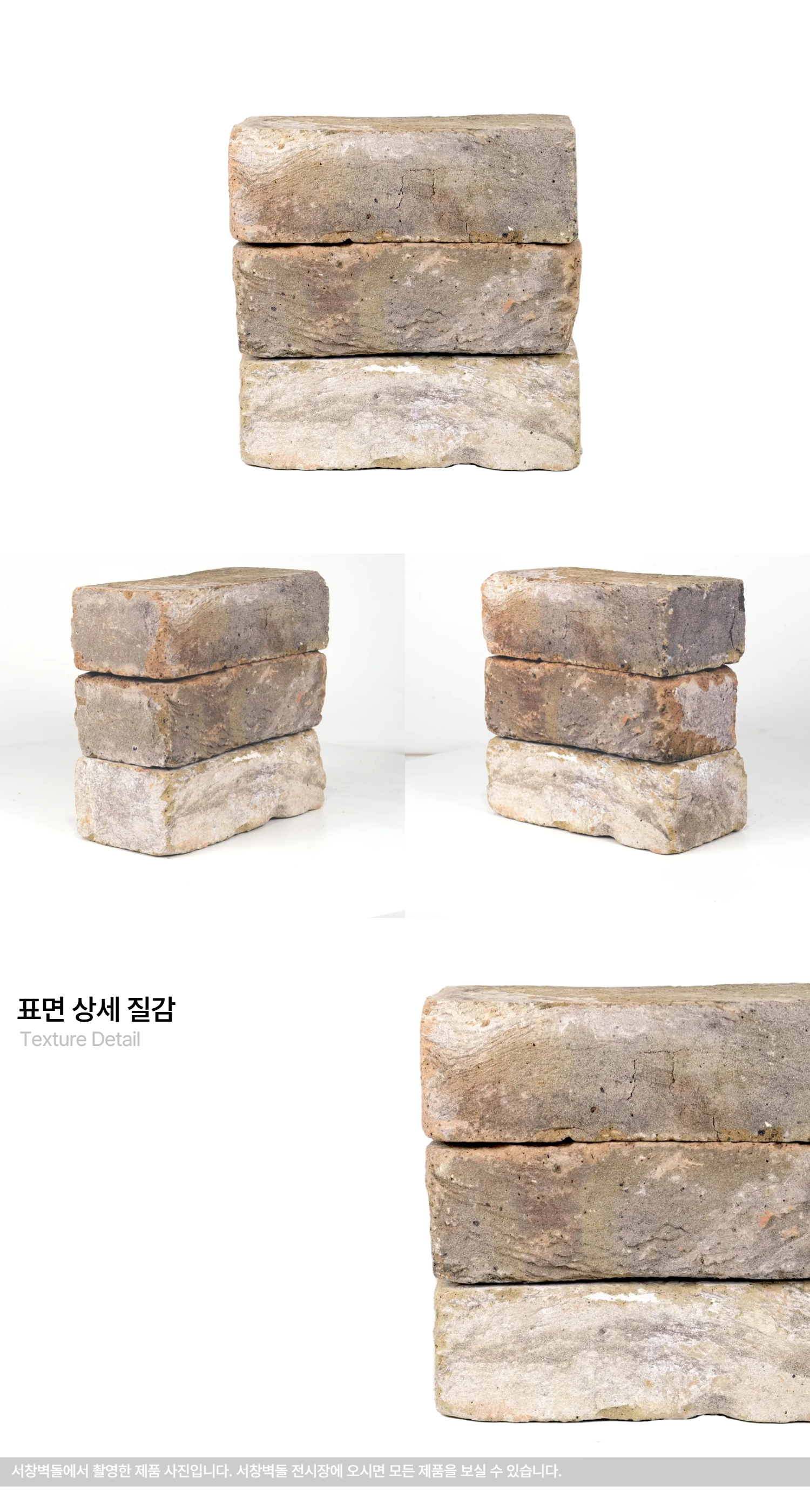 다른 모델은 풍파에 깍인듯한 표현이 되어 있는 경우도 있는데, 이 벽돌은 풍파를 이겨내고 견고한 모습 그대로 세월의 에이징만을 겪은 듯한 색감을 보여주고 있습니다.