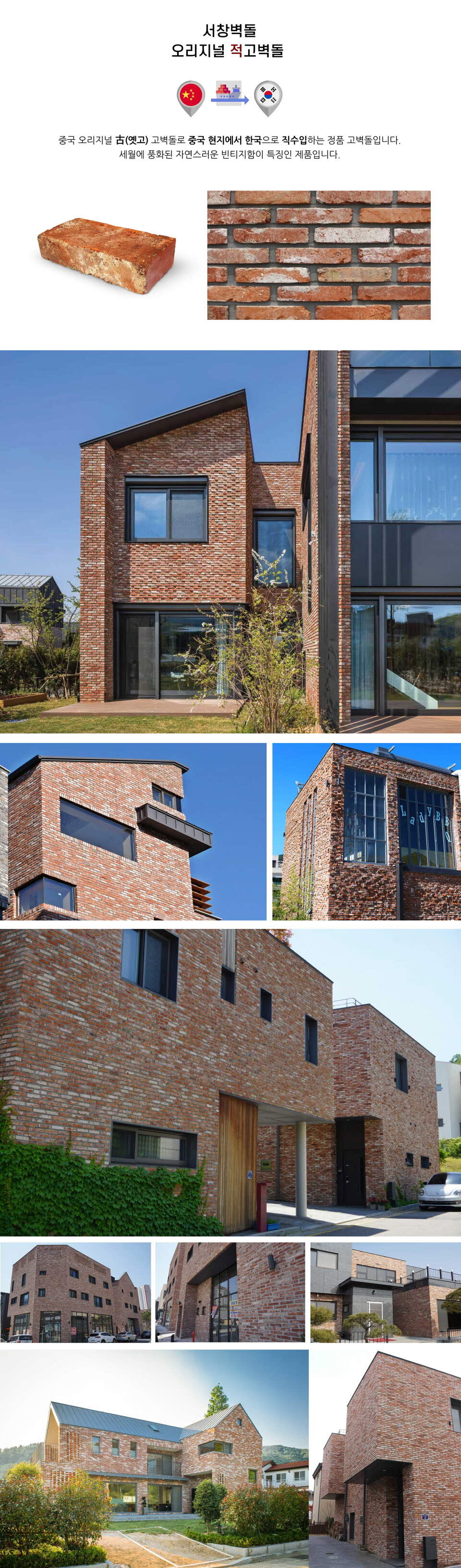 빈티지한 표면질감과 고급스러운 붉은색의 조합이 멋스러운 오리지널 적고벽돌입니다.