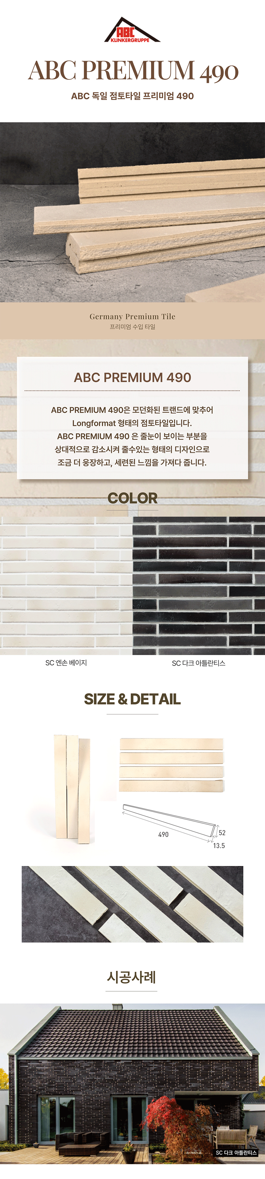 ABC PREMIUM 490은 모던화된 트랜드에 맞추어 Longformat 형태의 점토타일입니다.