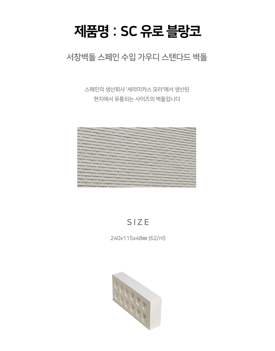 스페인의 생산회사 '세라미카스 모라'에서 생산된 현지에서 유통되는 사이즈의 벽돌입니다