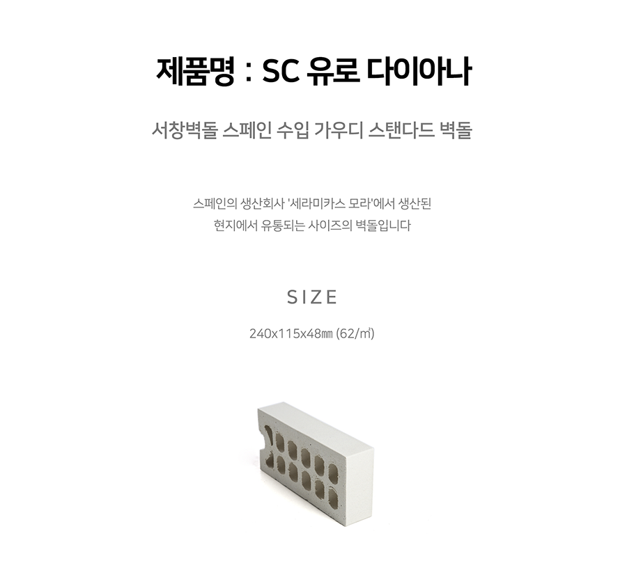 스페인의 생산회사 '세라미카스 모라'에서 생산된 현지에서 유통되는 사이즈의 벽돌입니다