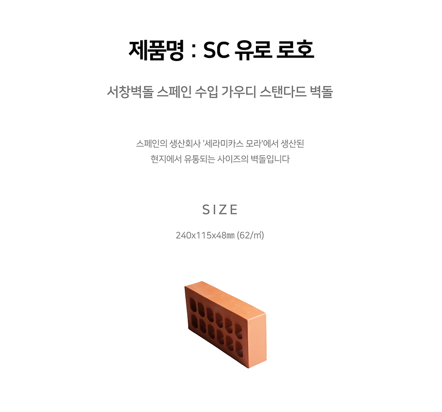 스페인의 생산회사 '세라미카스 모라'에서 생산된 현지에서 유통되는 사이즈의 벽돌입니다