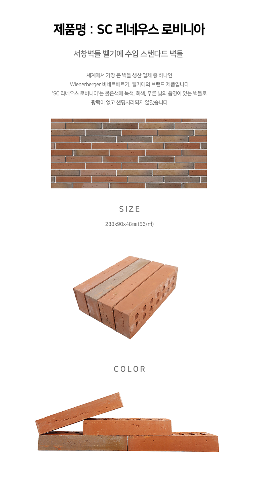 'SC 리네우스 로비니아'는 붉은색에 녹색, 회색, 푸른 빛의 음영이 있는 벽돌로 광택이 없고 샌딩처리되지 않았습니다.