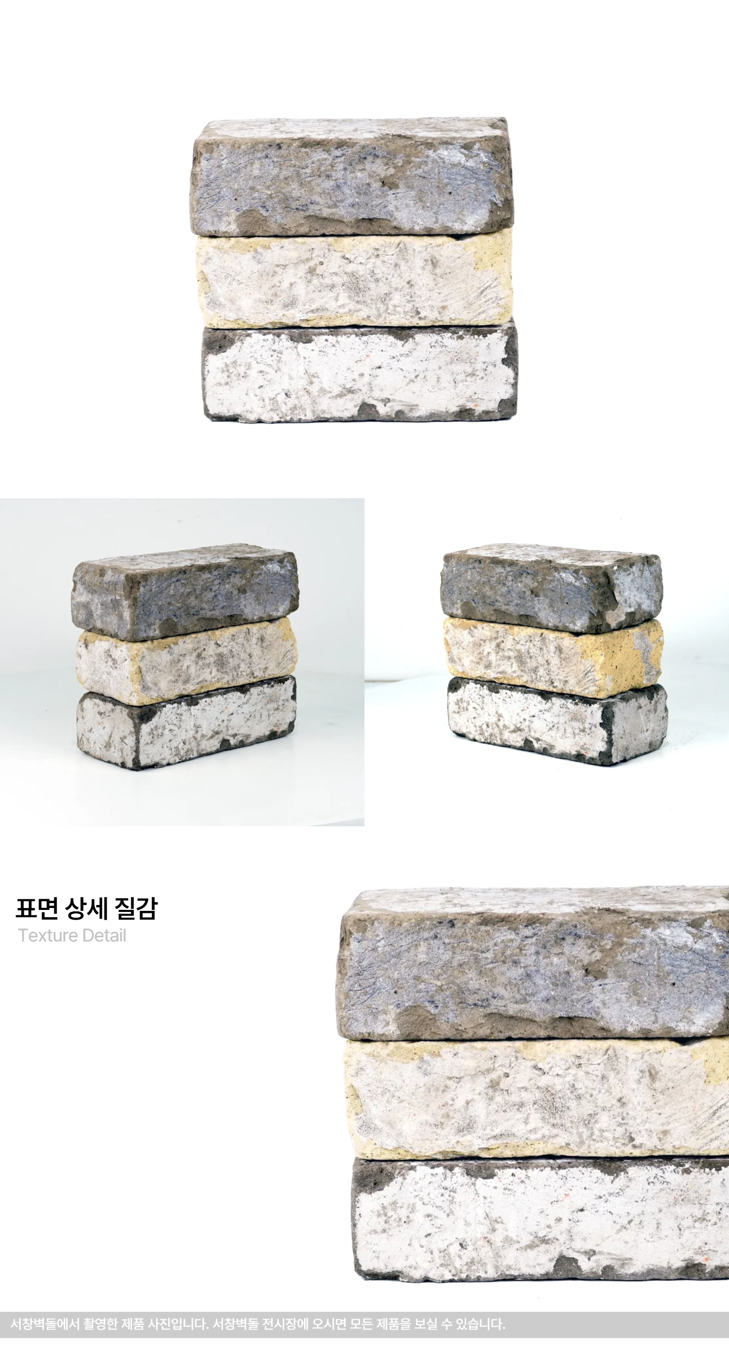 다른 모델은 풍파에 깍인듯한 표현이 되어 있는 경우도 있는데, 이 벽돌은 풍파를 이겨내고 견고한 모습 그대로 세월의 에이징만을 겪은 듯한 색감을 보여주고 있습니다.