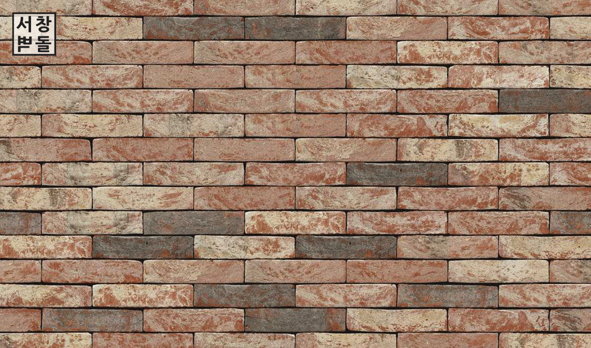 붉은색 바탕에 회백색, 적갈색, 검은색 등 다양한 색조가 혼합되어 있는 벽돌입니다.
