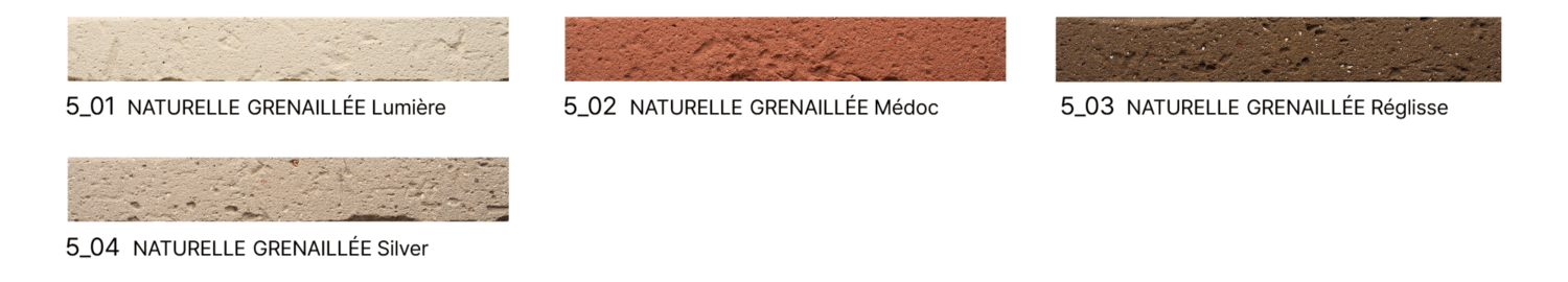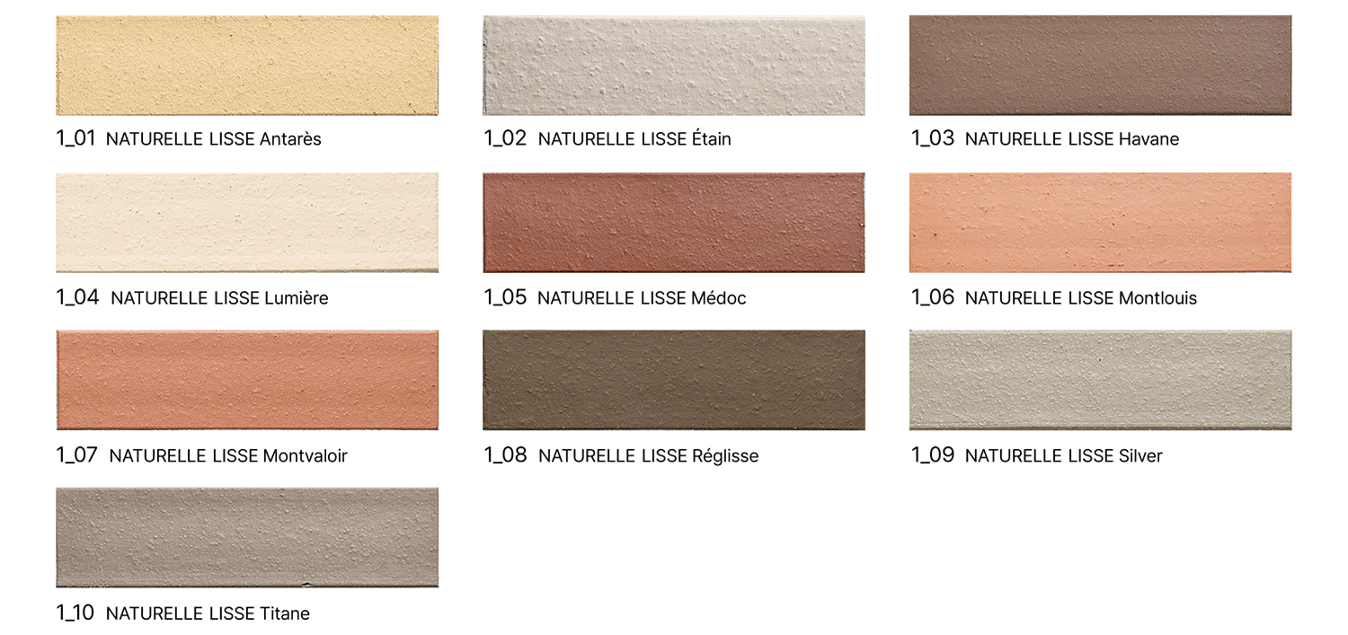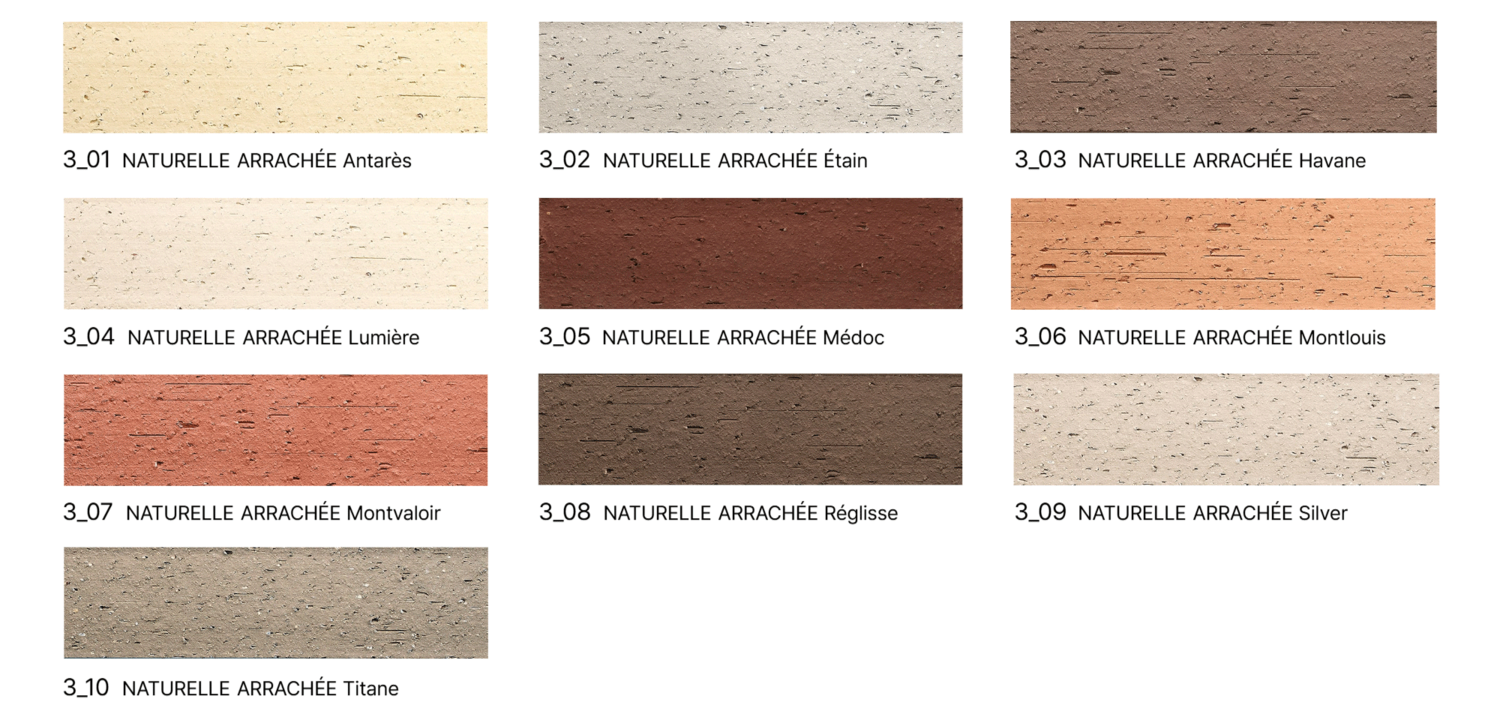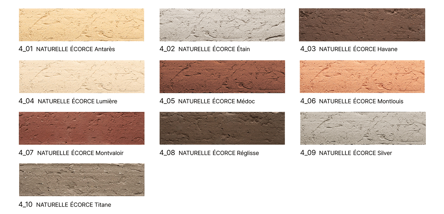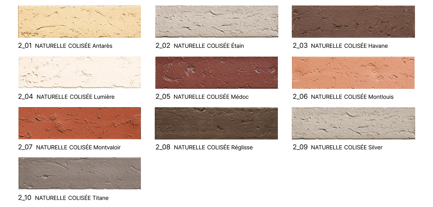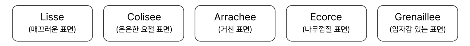 'Lisse (매끄러운 표면)', 'Colisee (은은한 요철 표면)', 'Arrachee (거친 표면)', 'Ecorce (나무껍질 표면)', 'Grenaillee (입자감 있는 표면)'으로 각 시리즈는 서로 다른 질감과 표면감을 가지고 있어, 건축물의 디자인 콘셉트와 용도에 맞게 선택하실 수 있습니다.