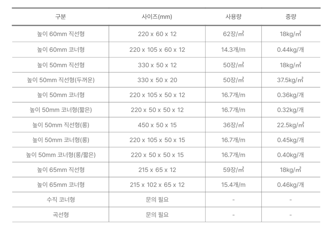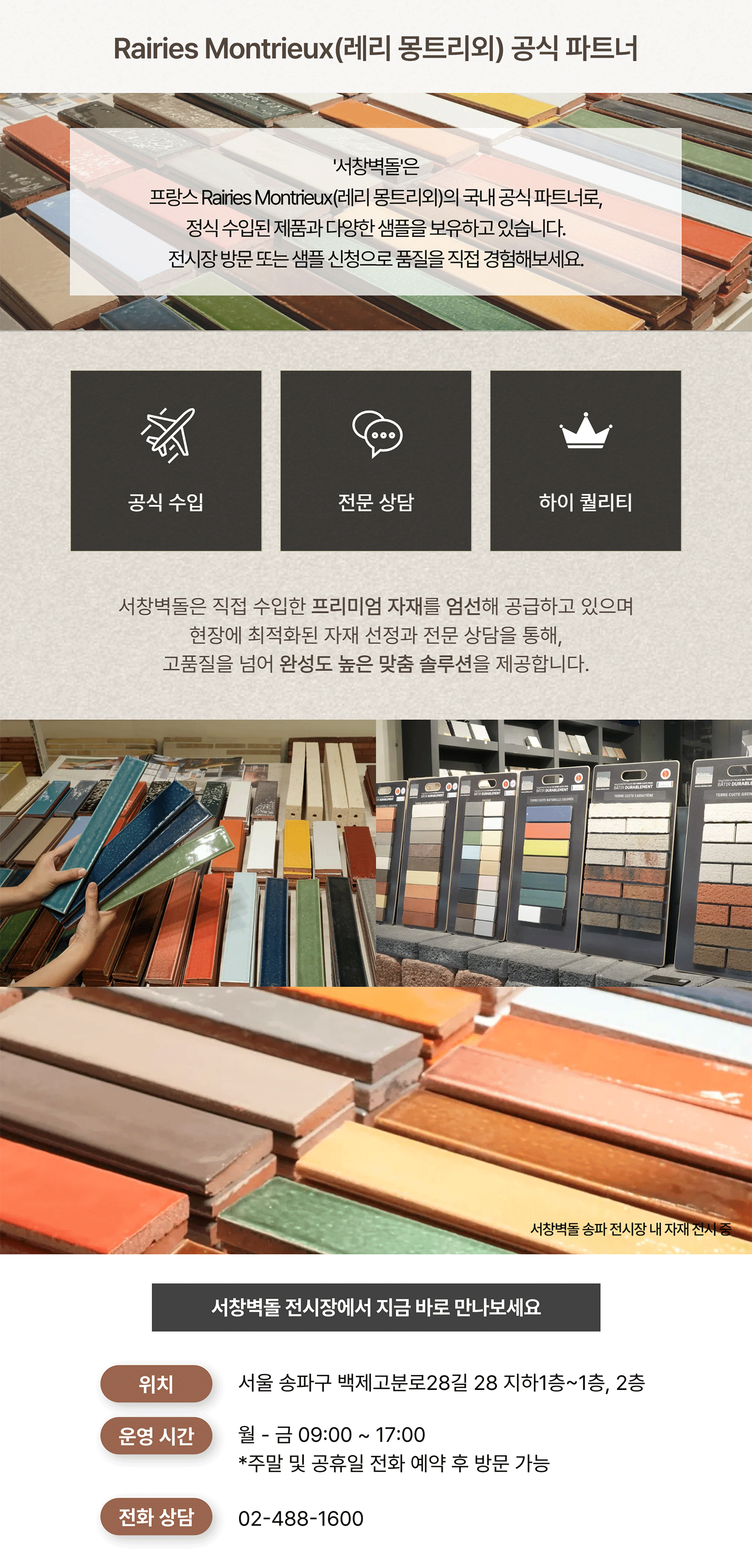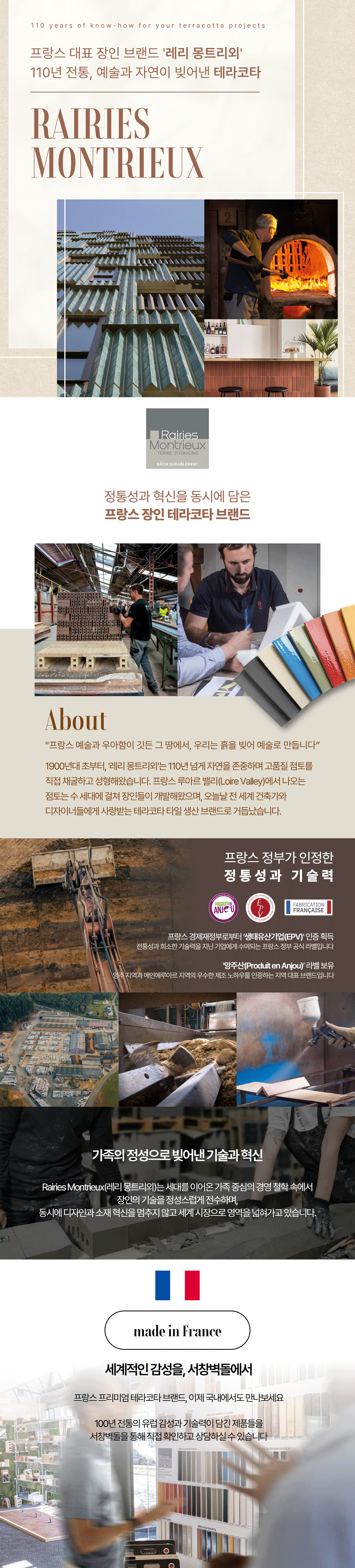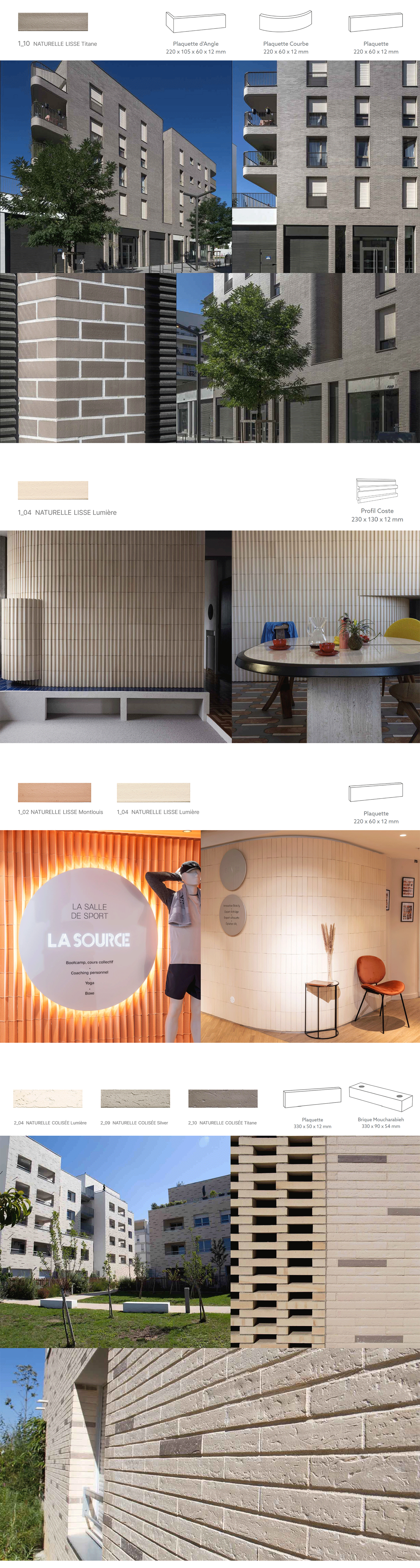 'Lisse (매끄러운 표면)', 'Colisee (은은한 요철 표면)', 'Arrachee (거친 표면)', 'Ecorce (나무껍질 표면)', 'Grenaillee (입자감 있는 표면)'으로 각 시리즈는 서로 다른 질감과 표면감을 가지고 있어, 건축물의 디자인 콘셉트와 용도에 맞게 선택하실 수 있습니다.