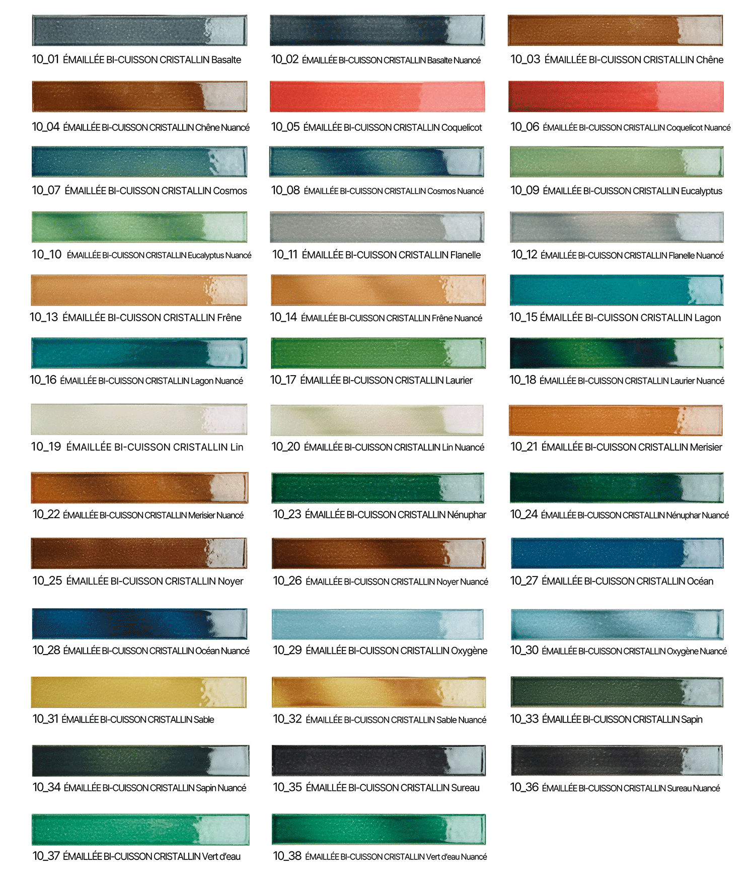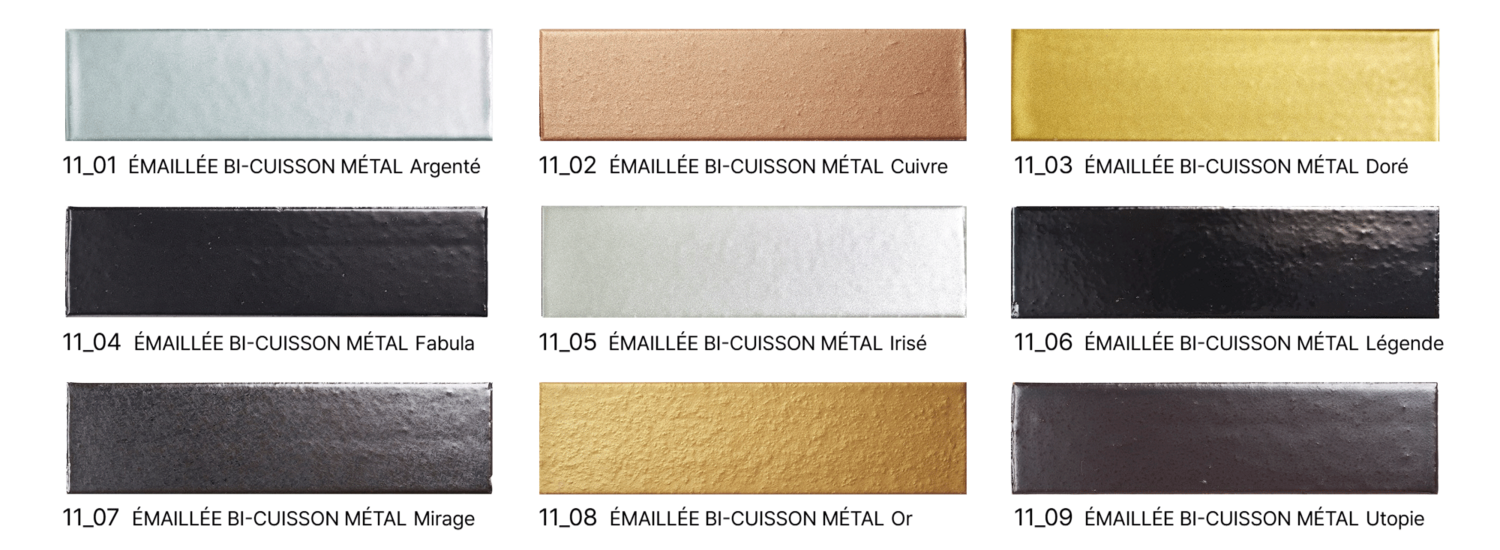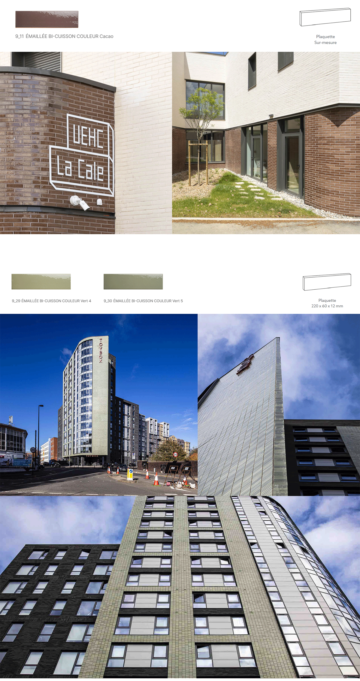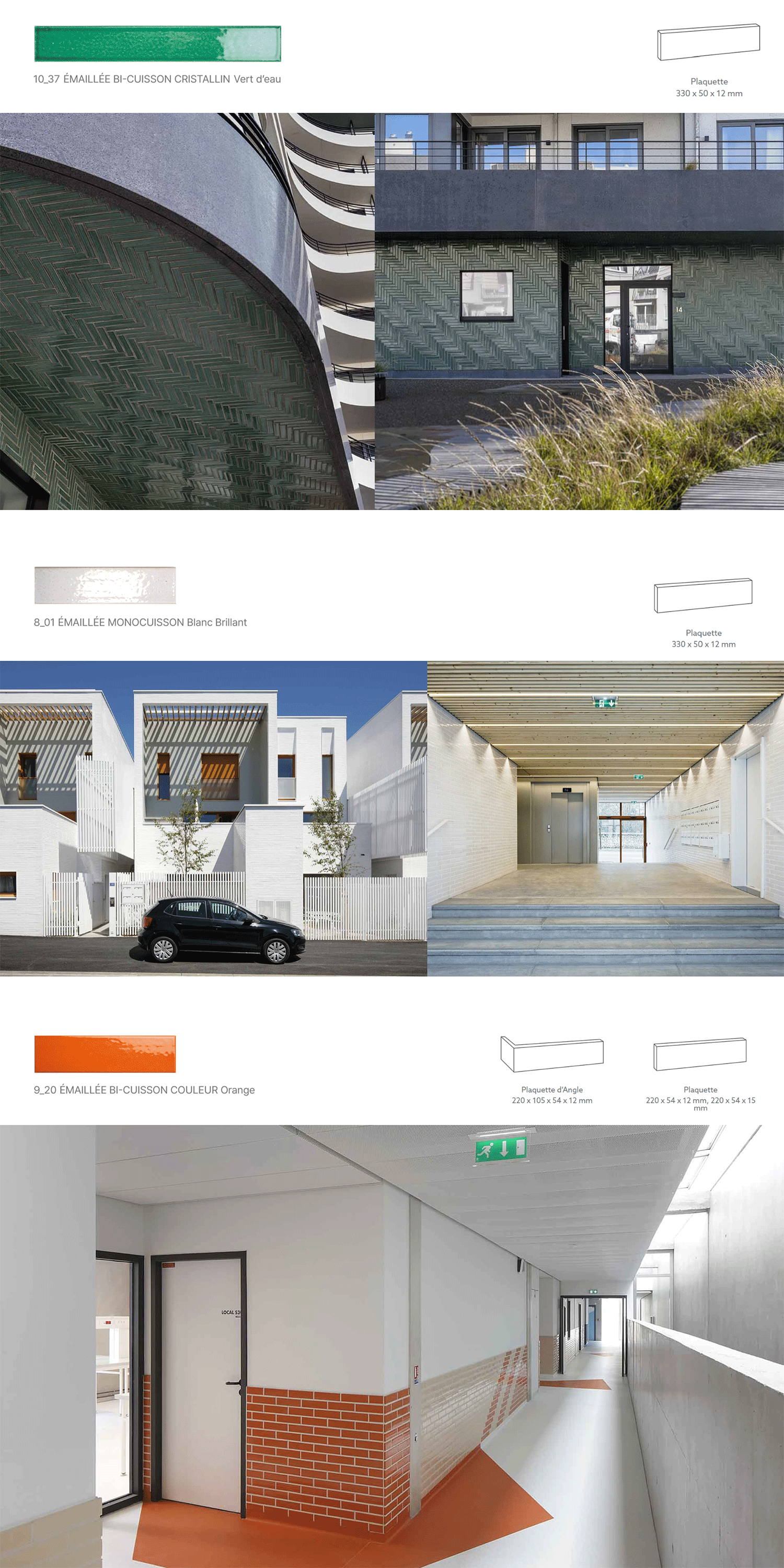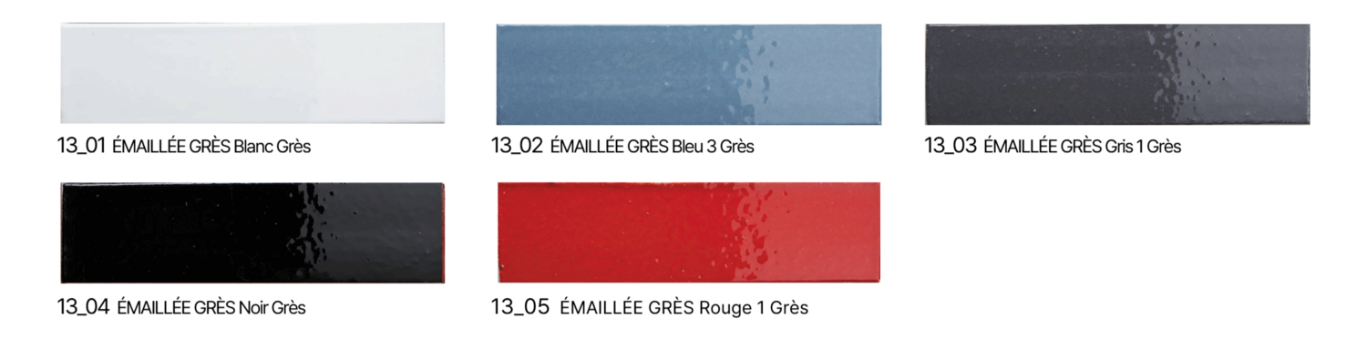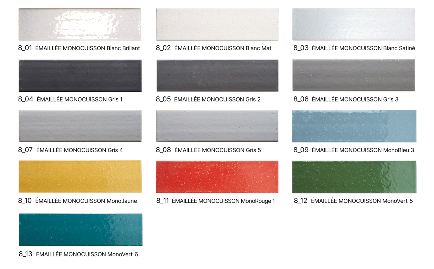 'Émaillés monocuisson(단일 소성 유약 처리)', 'Émaillés bicuisson (이중 소성 유약 처리)', 'Grès(스톤웨어)'로 각 시리즈는 서로 다른 질감과 표면감을 가지고 있어, 건축물의 디자인 콘셉트와 용도에 맞게 선택하실 수 있습니다.