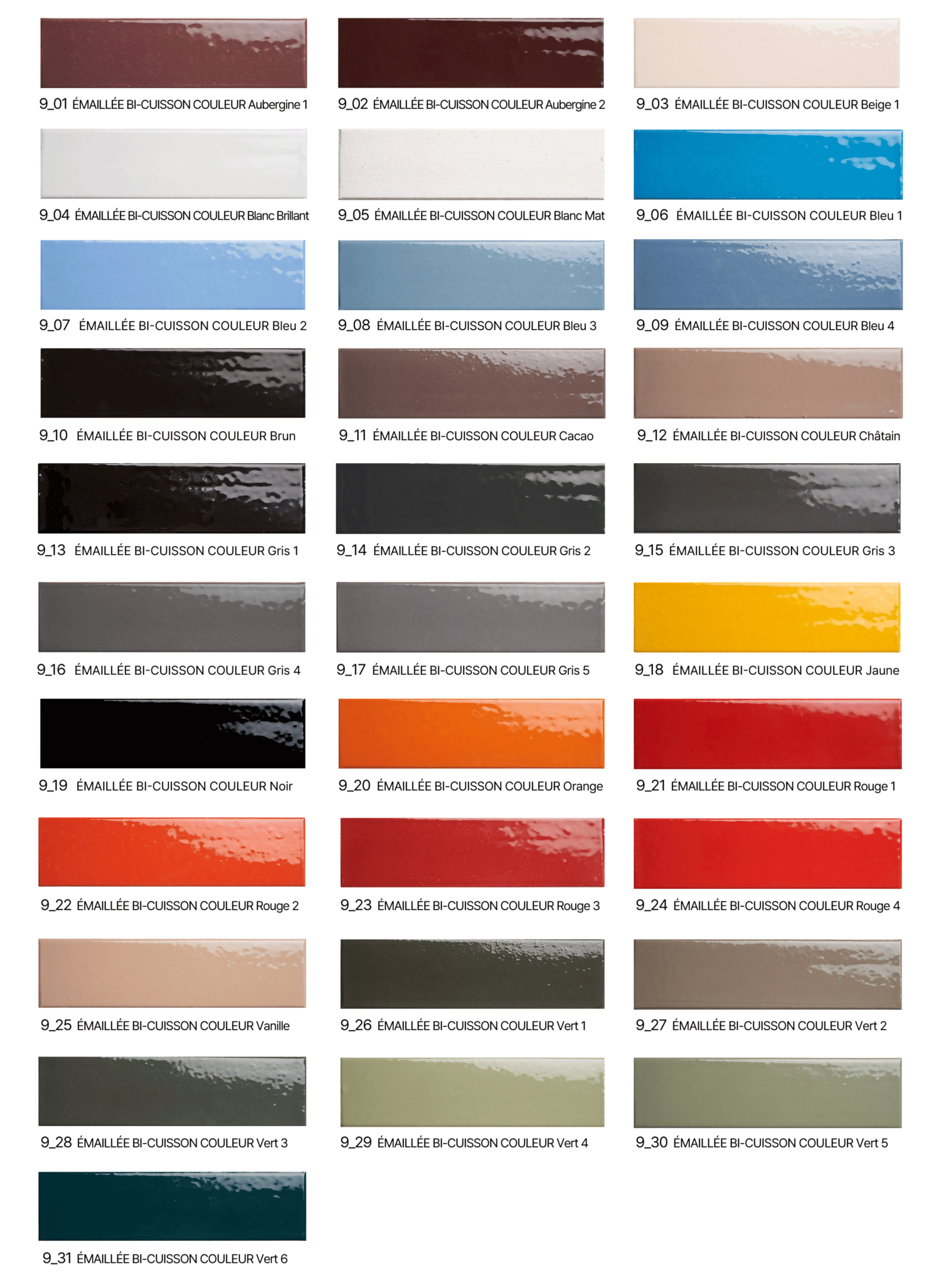 특히, 이중 소성(Émail bi-cuisson)은 고온에서 한 번 더 소성하는 공법으로 분쇄된 유리를 더욱 견고하게 만들고, 테라코타 표면의 자가 유리화(자동 유약화)와 유약의 완벽한 접착을 실현합니다.