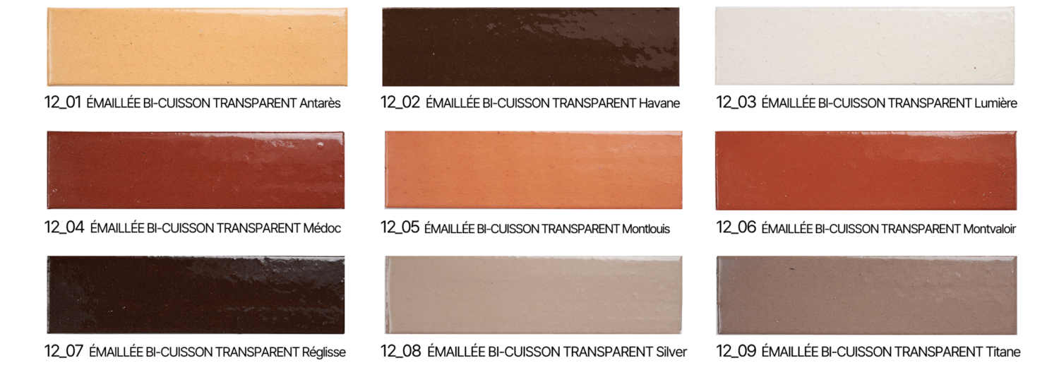 '단일 소성(Émaillés monocuisson)'과 '이중 소성(Émaillés bicuisson)' 유약 처리 방식이 모두 가능하여, 자연스러운 테라코타 질감부터 선명하고 깊이 있는 컬러까지 다양한 표현한 제품입니다. 또한, 내구성과 견고함이 뛰어난 '석기질(Grès)' 제품도 함께 제공하여 공간의 용도와 디자인에 맞는 최적의 솔루션을 제안합니다.