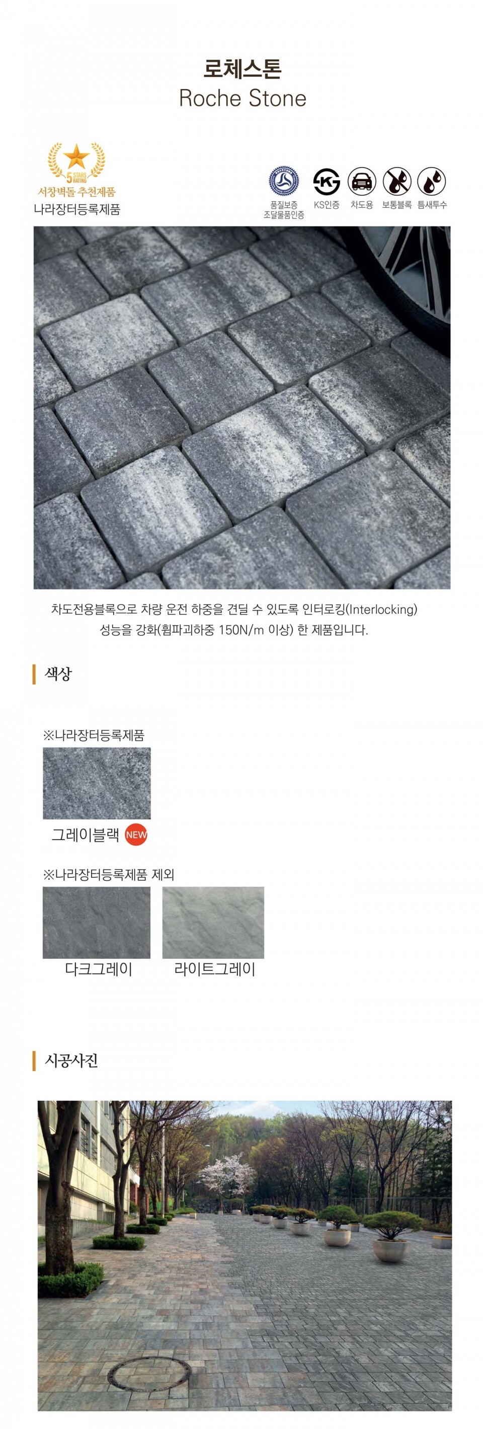 》차도전용블록으로 차량 운전 하중을 견딜 수 있도록 인터로킹 성능을 강화(휨파괴하중 150N/m 이상)한 제품입니다
