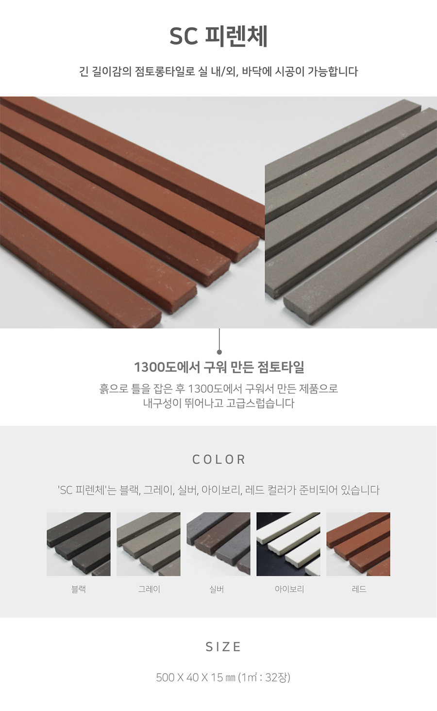 흙으로 틀을 잡은 후 1300도에서 구워서 만든 제품으로, 실내/외 바닥에 시공이 가능하며 코너타일이 있습니다.