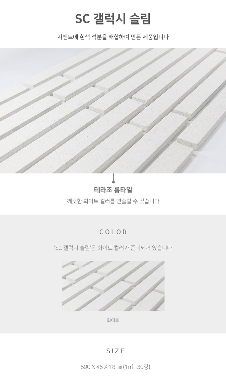 'SC 갤럭시 슬림'은 시멘트에 흰색 석분을 배합하여 만든 제품으로, 깨끗한 화이트 컬러를 연출할 수 있습니다.