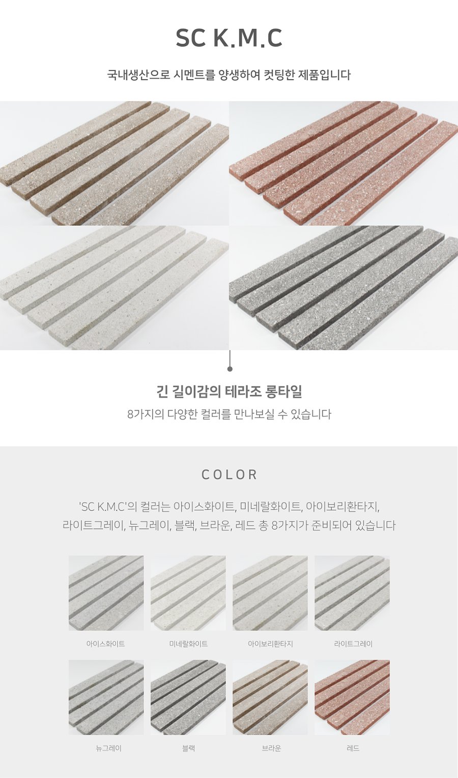 SC K.M.C의 컬러는 아이스화이트, 미네랄화이트, 아이보리환타지, 라이트그레이, 뉴그레이, 블랙, 브라운, 레드 총 8가지가 준비되어 있습니다. 국내생산으로 시멘트를 양생하여 컷팅한 제품입니다.