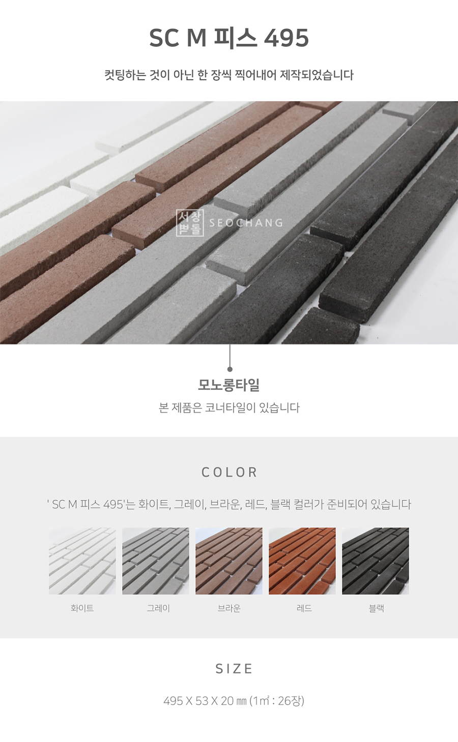 국내에서 생산된 제품으로 코너타일이 있습니다. 롱 벽돌을 컷팅하는 것이 아닌 한 장씩 찍어내어 제작되었습니다.