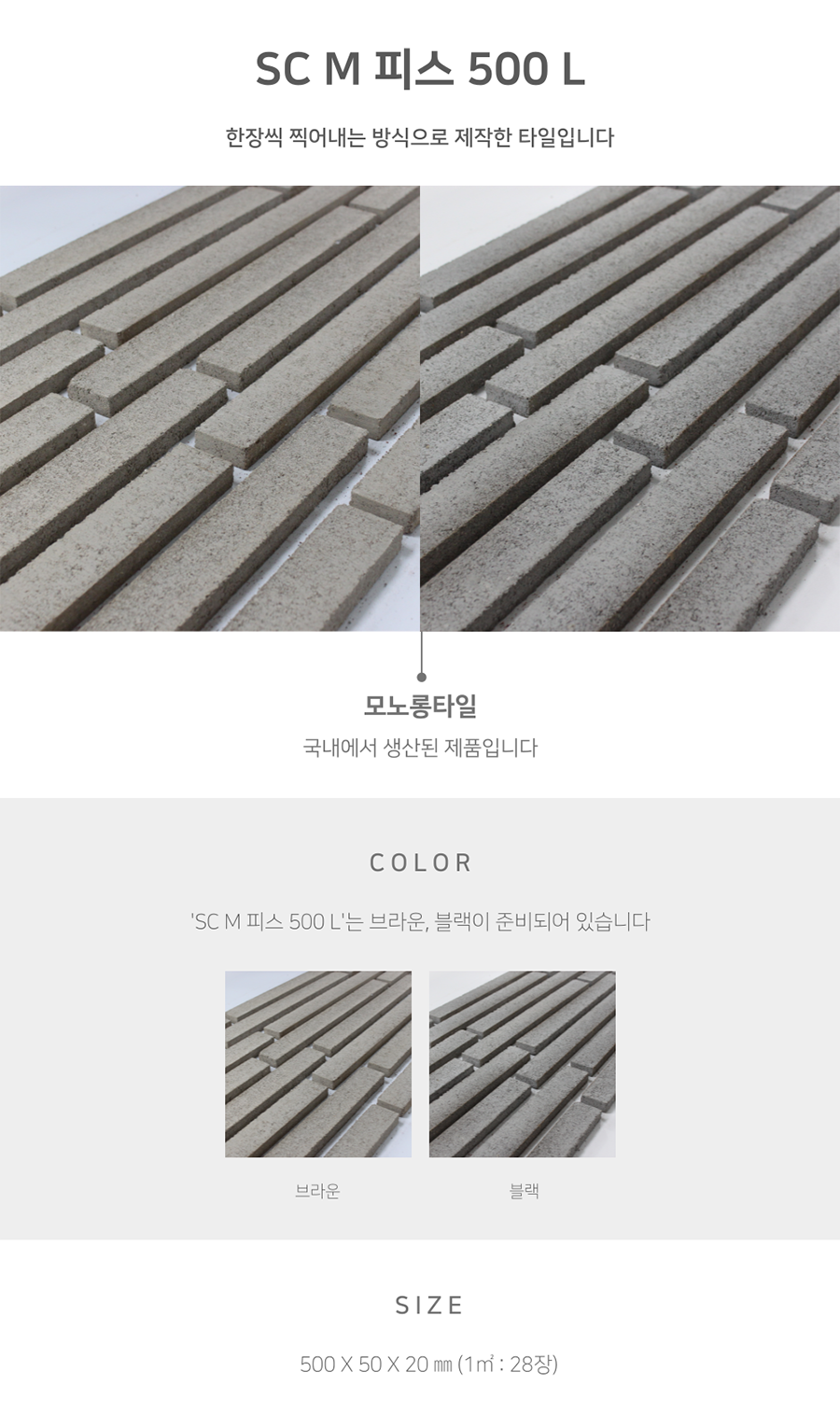 국내에서 생산 제품으로 롱 벽돌을 컷팅하는게 아닌 한장씩 찍어내는 방식으로 제작합니다.