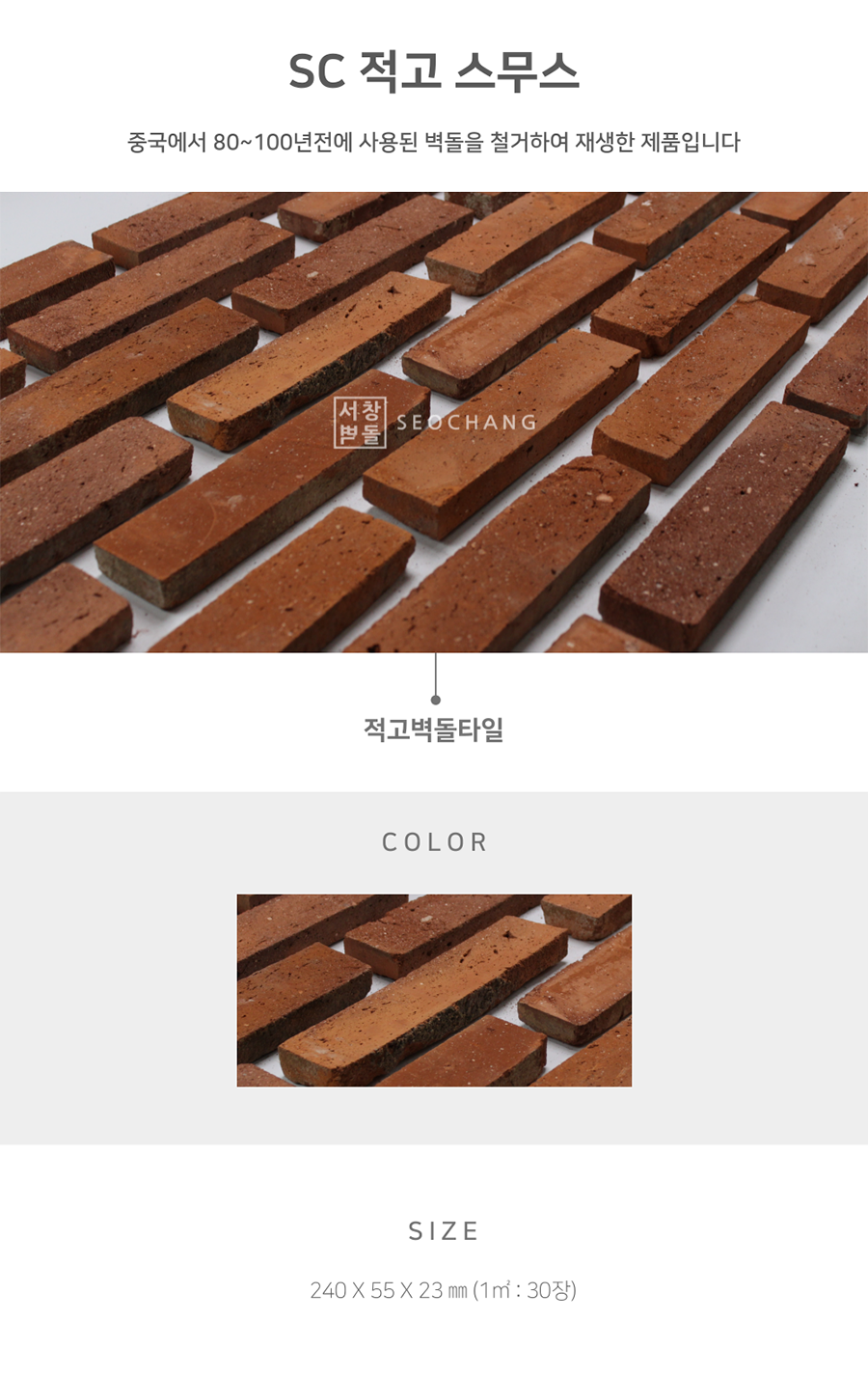 적고벽돌의 컷팅면을 사용하는 제품으로 깔끔하면서 엔틱한 컬러느낌을 연출 할 수 있습니다.