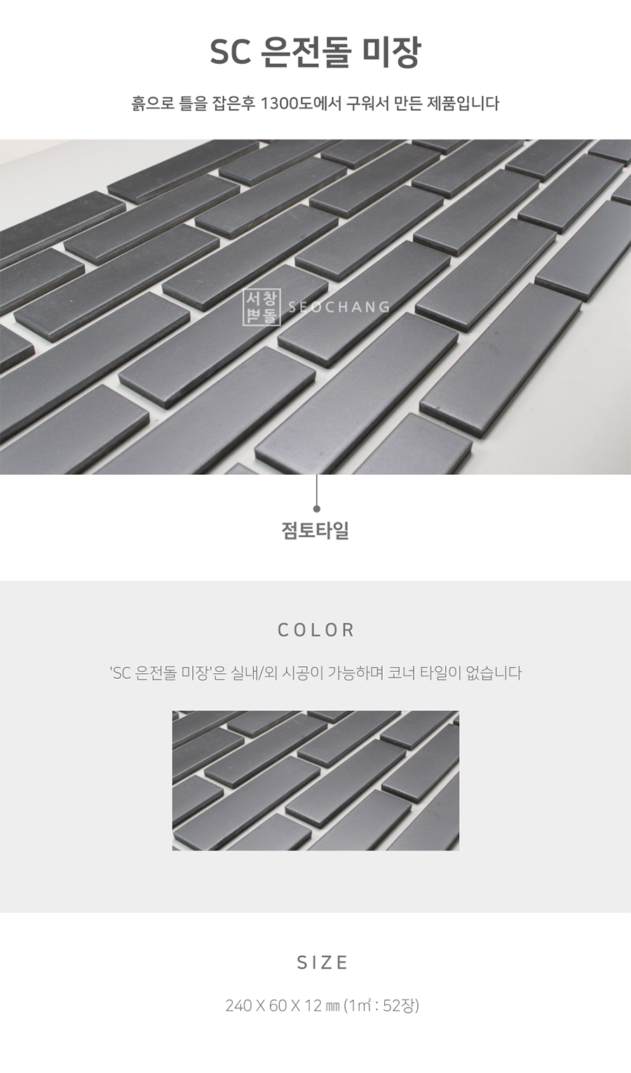 흙으로 틀을 잡은 후 1300도에서 구워서 만든 제품으로, 실내/외 시공이 가능하며 코너 타일이 없습니다.