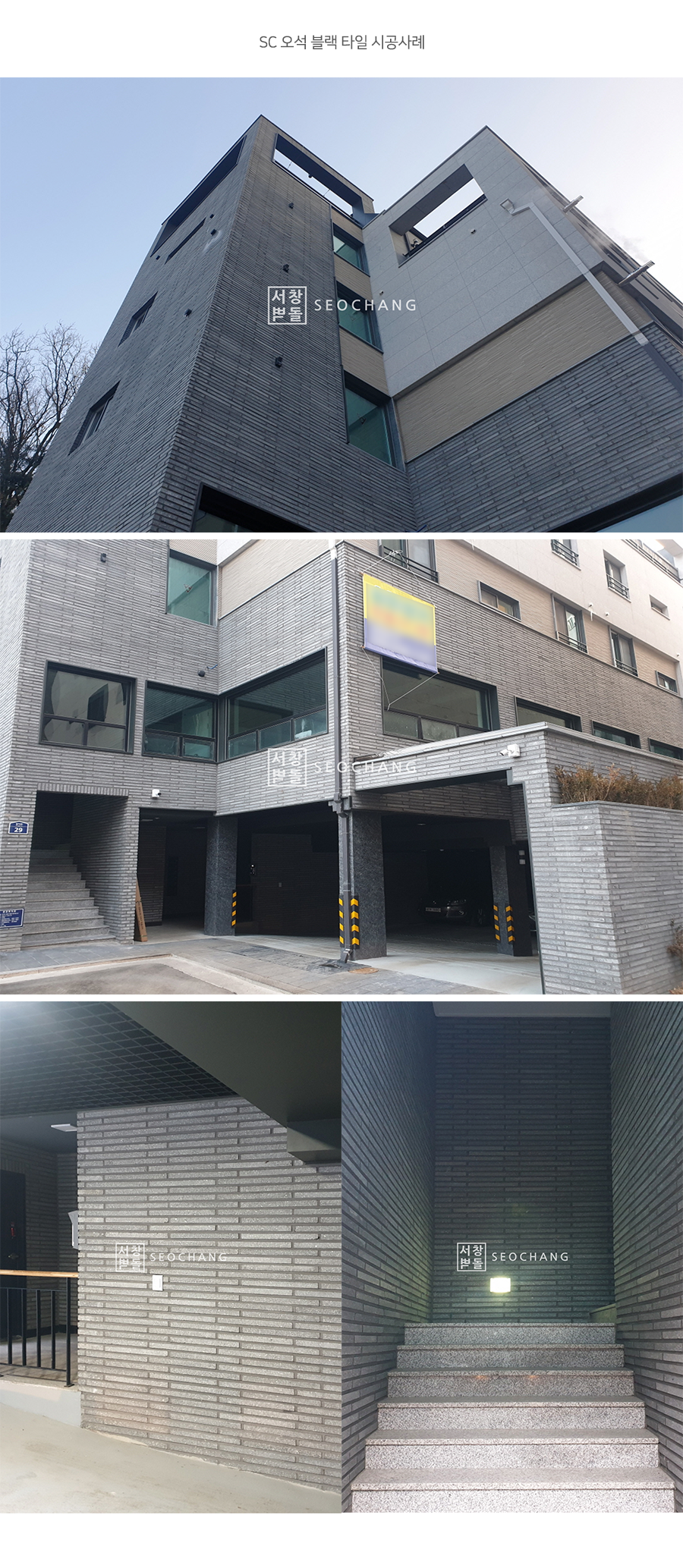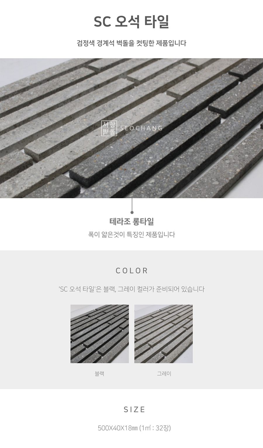 'SC 오석타일'은 검정색 경계석 벽돌을 컷팅한 제품으로 폭이 얇은것이 특징입니다.