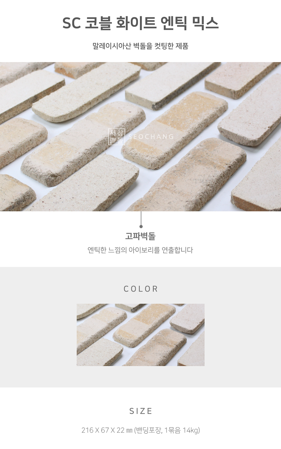 말레이시아산 벽돌을 컷팅한 제품으로, 겉장과 컷팅면을 사용하여 엔틱한 느낌의 아이보리를 연출합니다.
