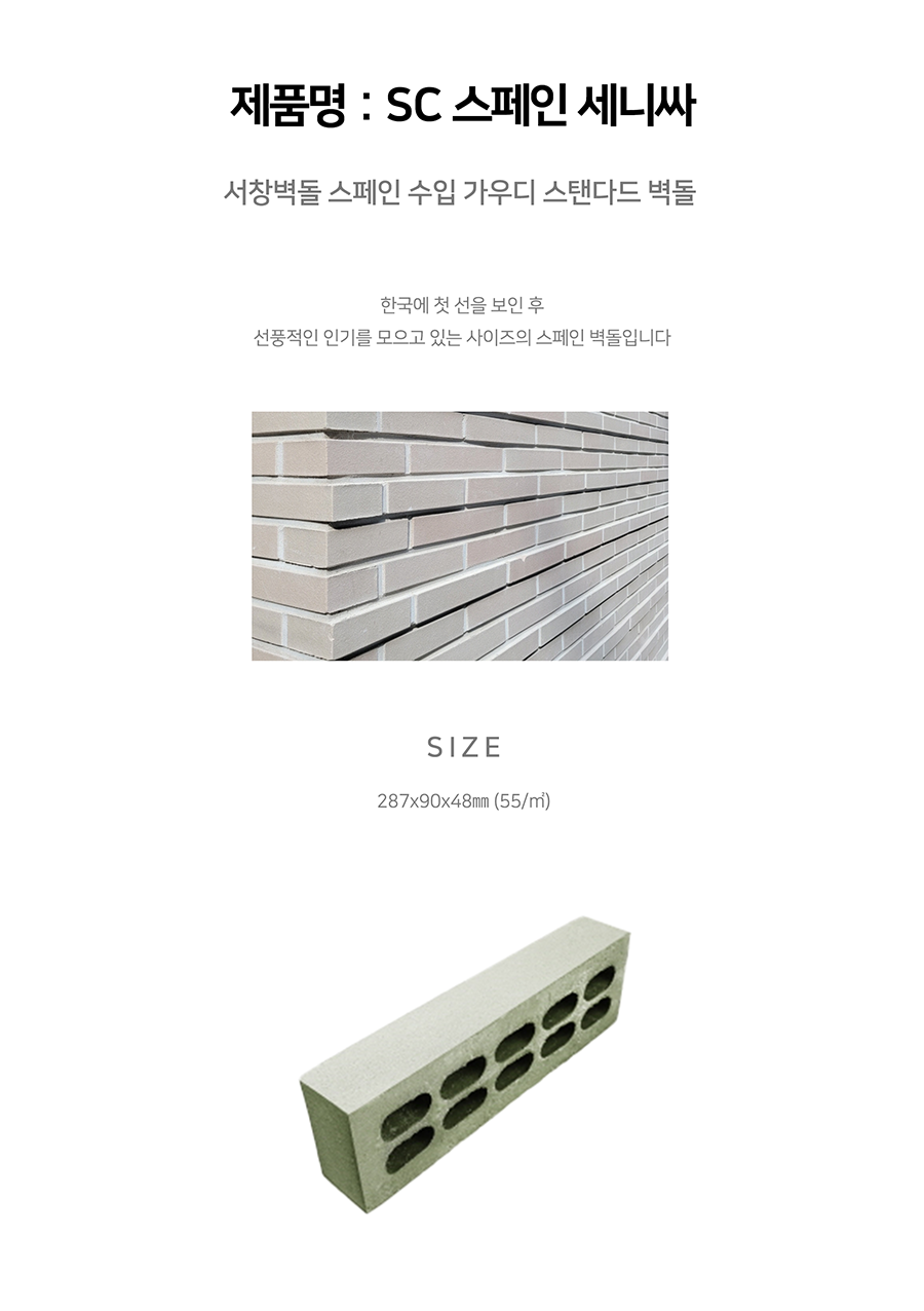 스페인의 건축감성을 느낄 수 있는 크링커 벽돌 시리즈로 한국에 첫 선을 보인 후 선풍적인 인기를 모으고 있는 사이즈의 벽돌입니다.