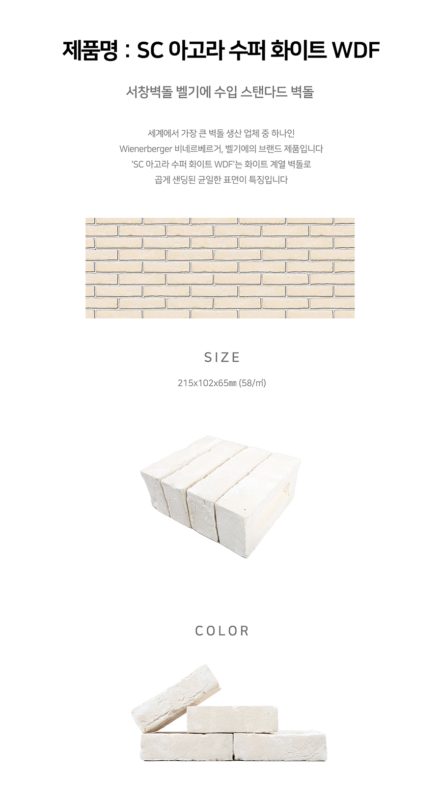 'SC 아고라 수퍼 화이트 WDF'는 화이트 계열 벽돌로 곱게 샌딩된 균일한 표면이 특징입니다.