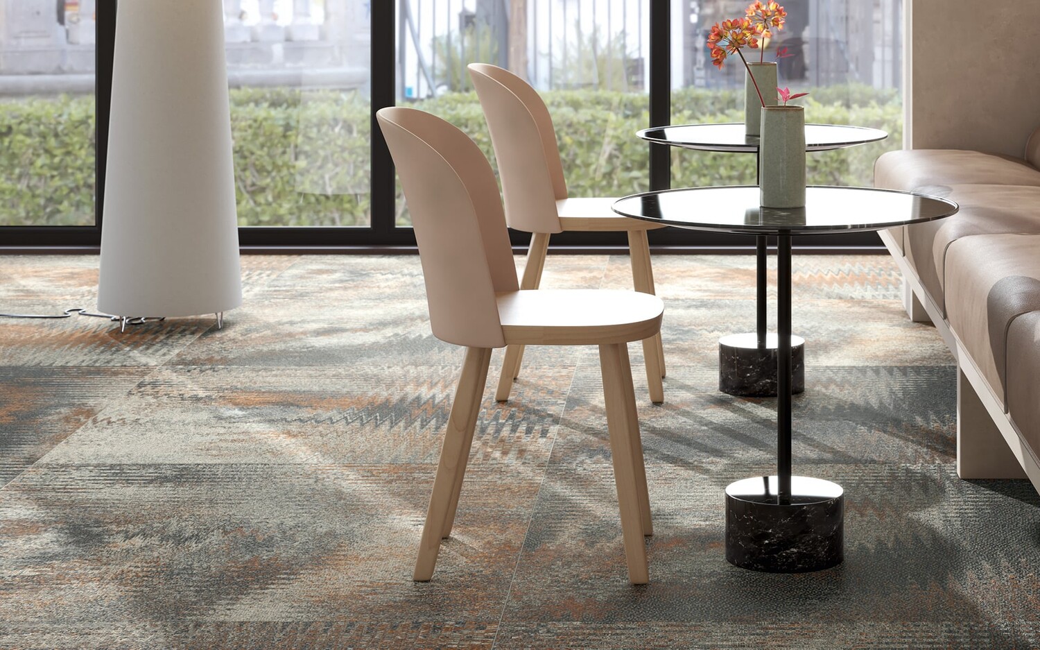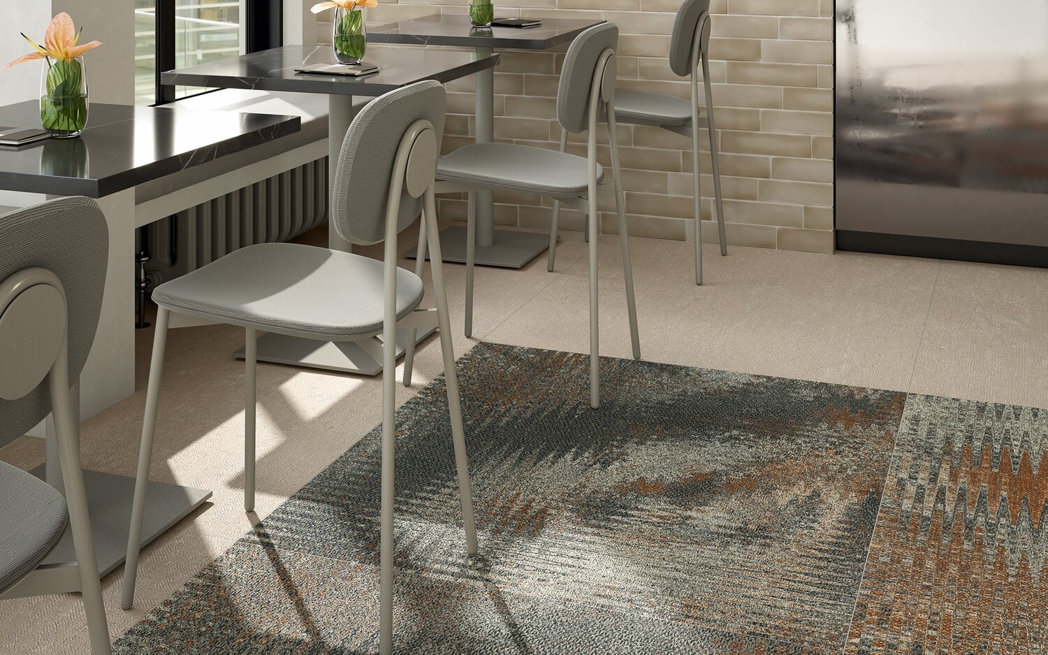 트라메 칼레이도스코피오는 정형화된 타일의 틀을 깨고, 정교하게 짜인 카펫의 질감과 기하학적 패턴을 현대적인 슬래브 위에 새겼습니다.