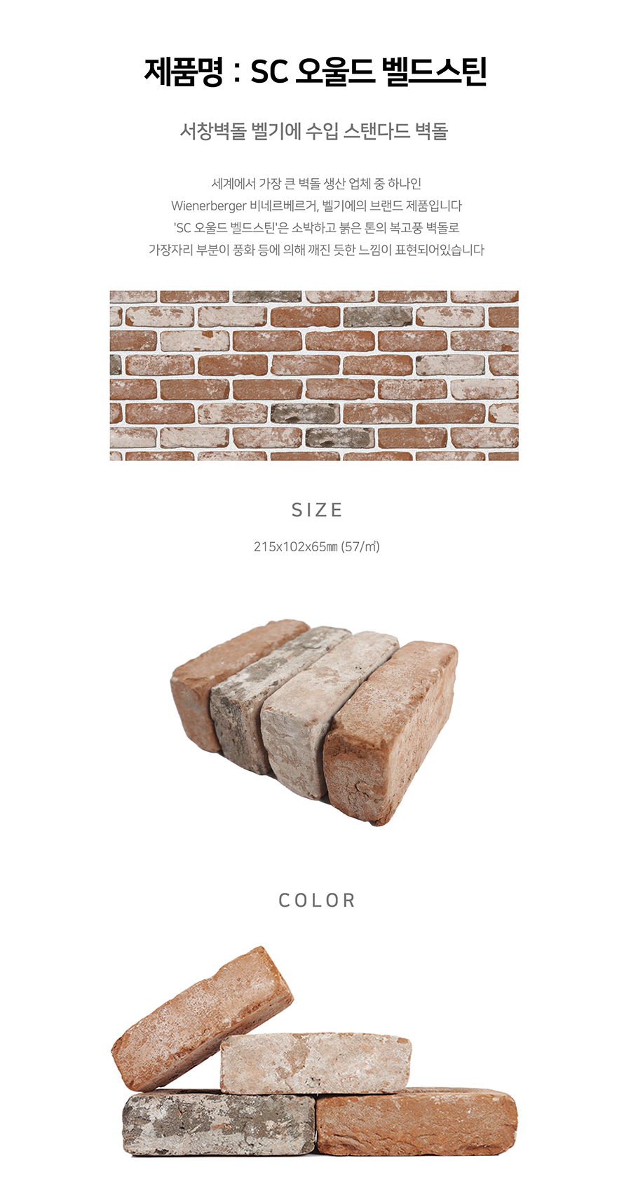 'SC 오울드 벨드스틴'은 소박하고 붉은 톤의 복고풍 벽돌로 가장자리 부분이 풍화 등에 의해 깨진 듯한 느낌이 표현되어있습니다.
