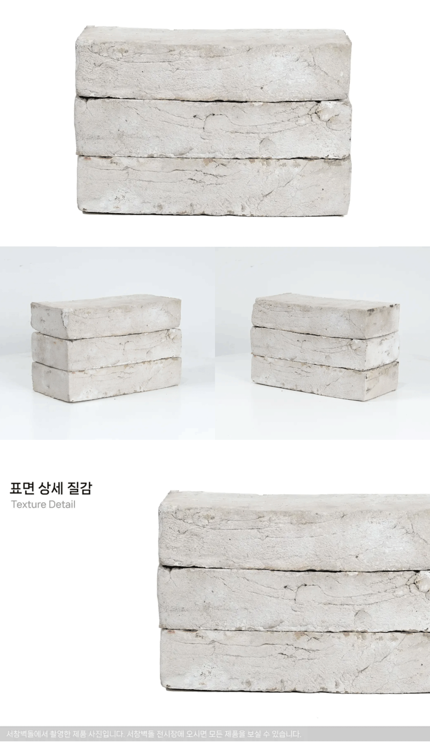 빈티지 스탠다드는 세련되고 깔끔한 외관에, 셀모스러운 질감을 부여한 듯한 빈티지, 훈연으로 그을린 벽돌입니다. 색상은 전반적으로 흰색이고 속에 미묘한 아이보리빛이 스며나오는 컬러감을 지니고 있습니다.